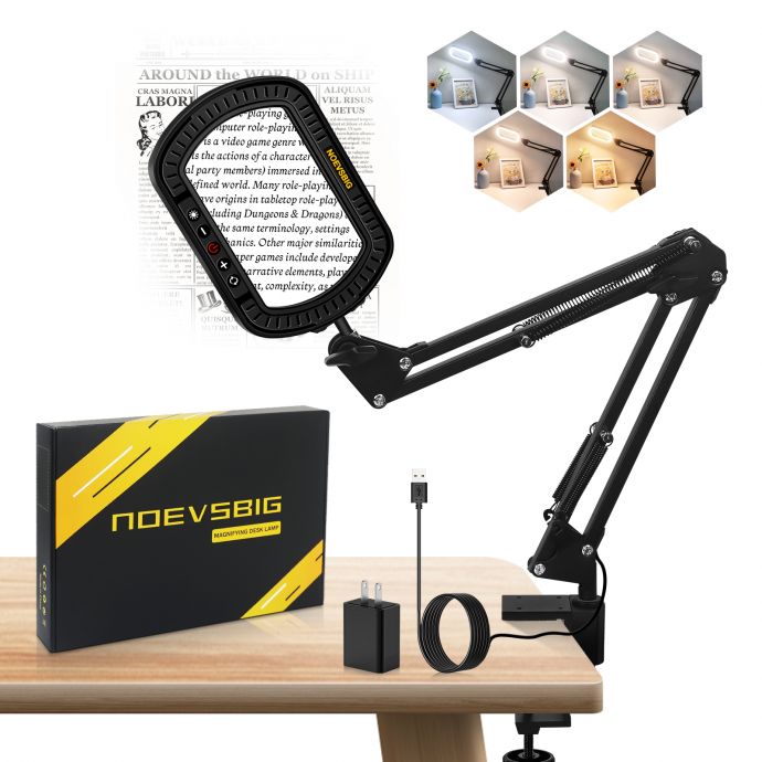 NOEVSBIG Magnifying Glass Desk Lamp with 3-Section Swing Arm and Big Clamp, Magnifying Glass with Light and Stand, 10X Wide Desk Magnifier Light for Reading/Office/Crafting/Close Work